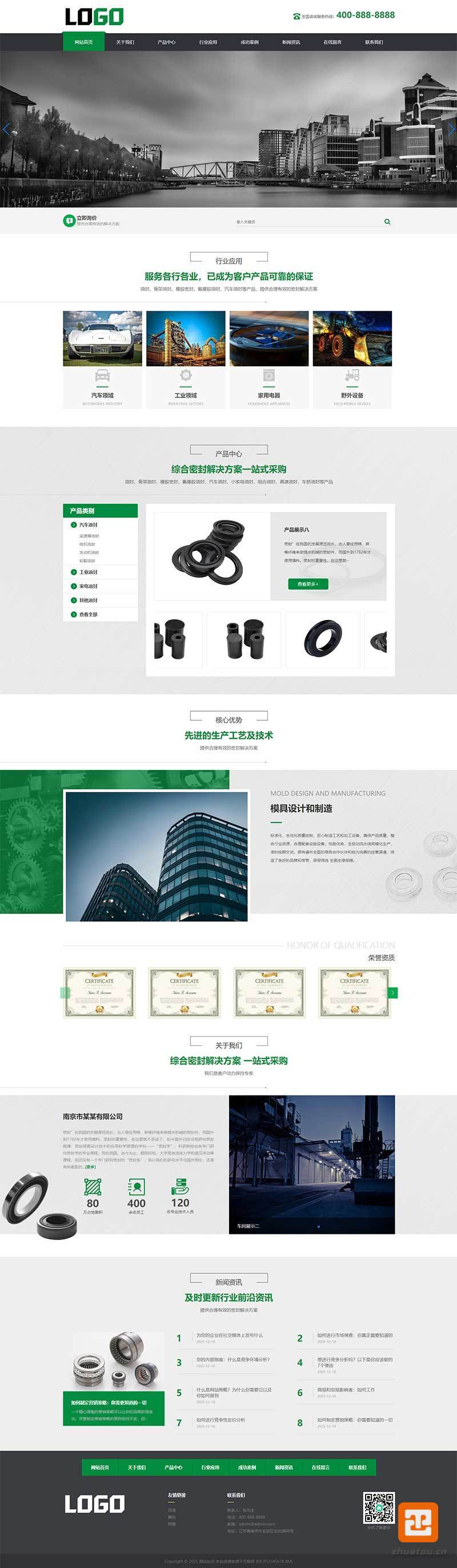专为泵阀、化工、矿山机械领域打造的机械密封件网站模板。全站采用工业黑 + 绿色配色,贴合行业视觉认知。模板聚焦「产品展示 - 方案匹配 - 在线询盘」转化链路,首页突出密封件耐温、耐压、耐腐蚀核心卖点。支持按密封材质、适用工况、配套设备分类展示产品,适配移动端与工业大屏双端浏览。