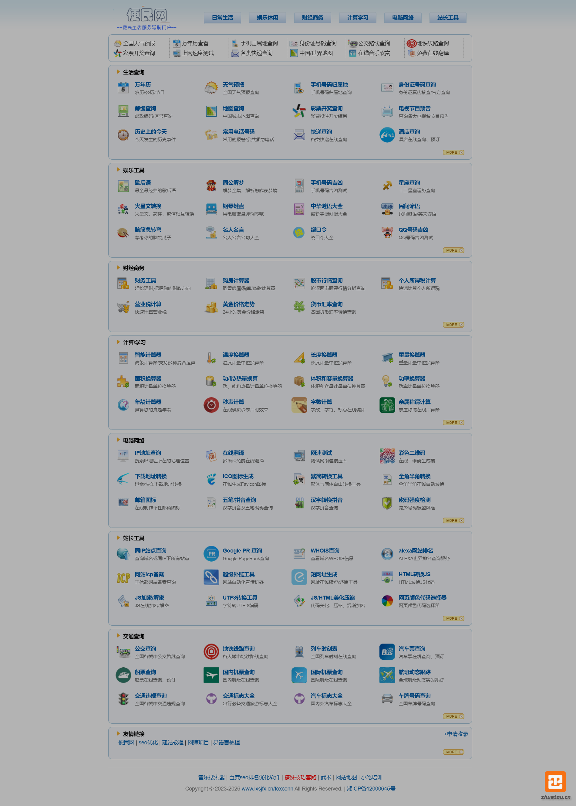 4、增加了工具箱头部、顶部、中间广告位的JS调用,增加若干个查询工具,具体请查看源码本身,淮安便民网为您打造真正绿色的免费的生活查询工具大全。
