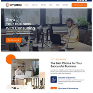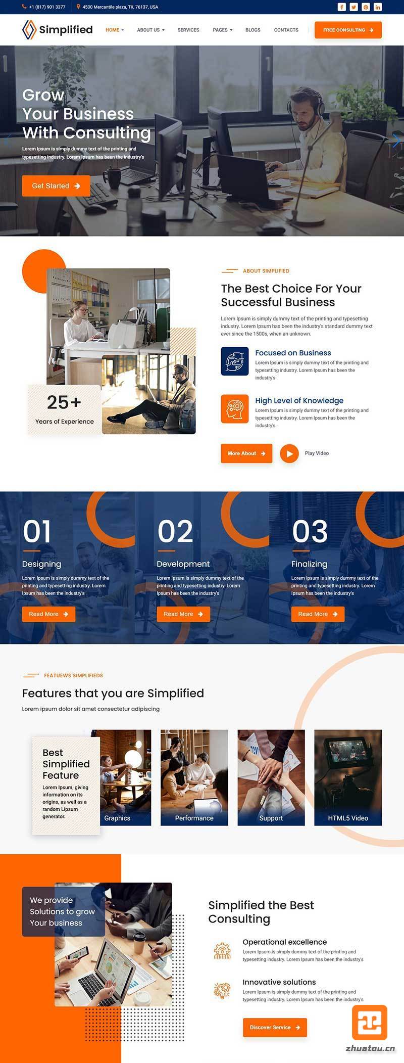 首页提供了三种不同风格,企业可根据自身品牌特色和目标受众喜好进行选择。首页以醒目的标语吸引访客注意力,搭配团队工作场景的图片,传达出专业且积极的服务氛围。同时,展示了企业拥有的25年以上经验,以及作为成功企业最佳选择的优势,如专注于商业、知识水平高等。还通过三个步骤(设计、开发、完成)简要介绍了服务流程,让访客快速了解服务概况。